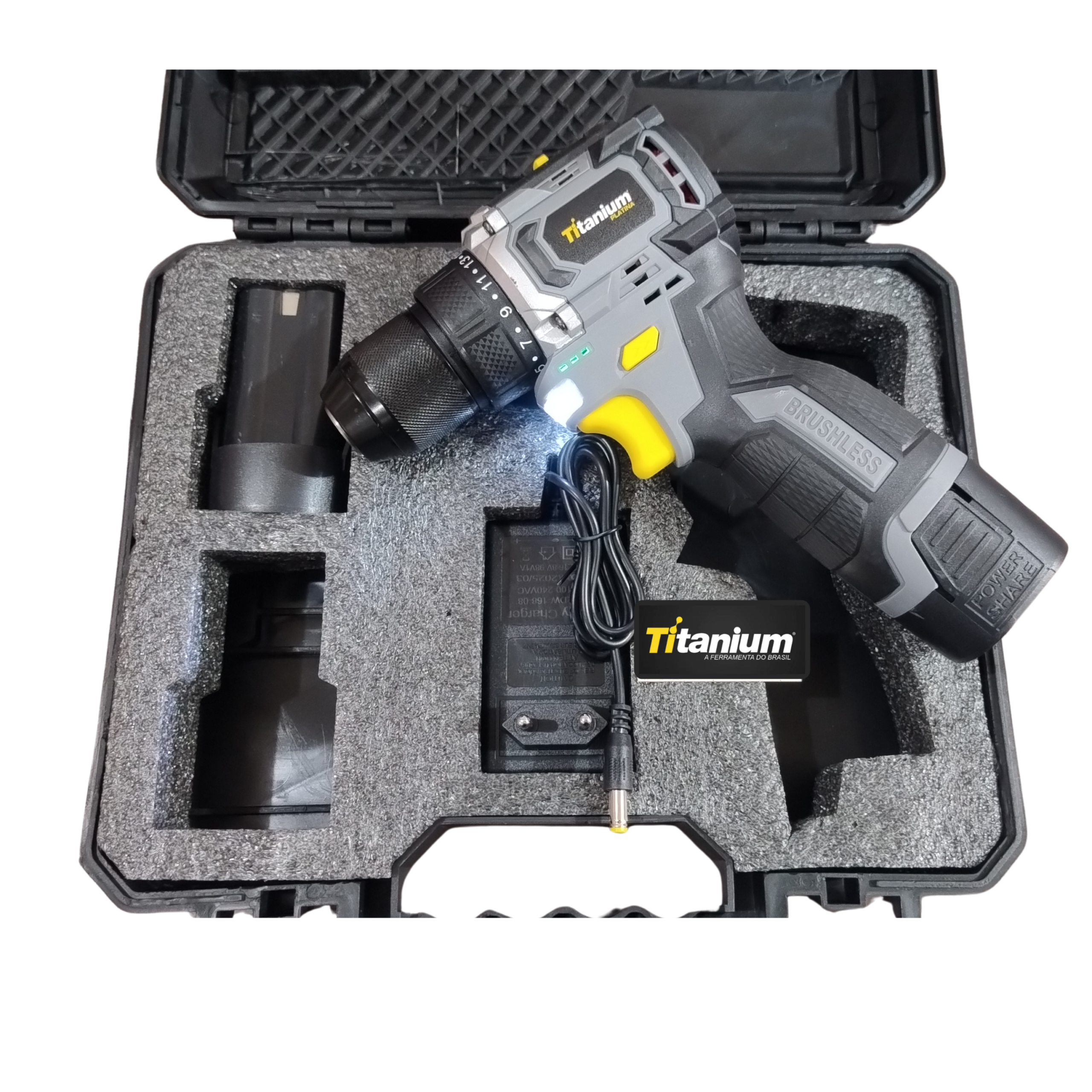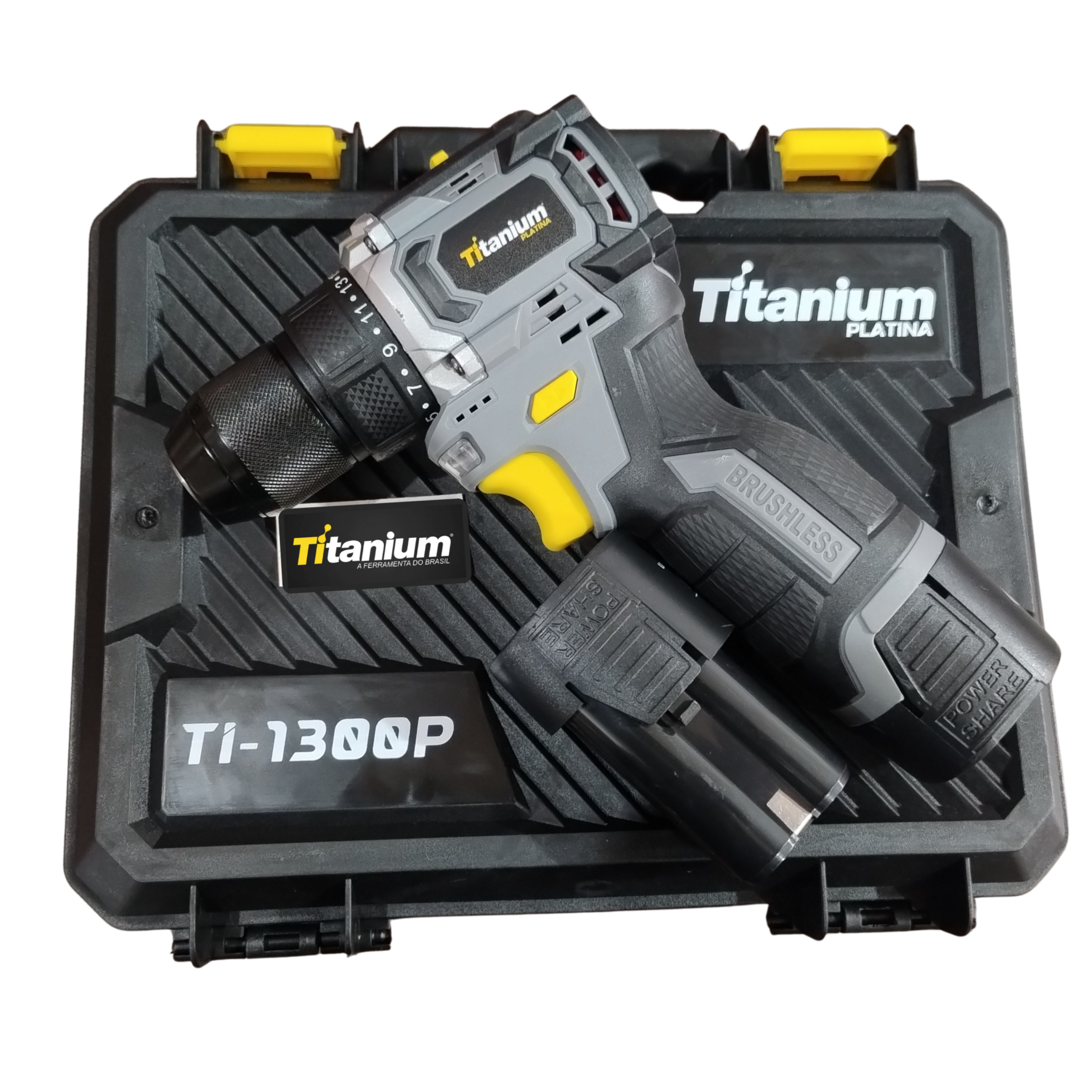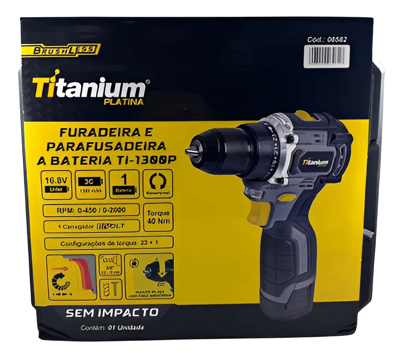 PARAFUSADEIRA E FURADEIRA A BATERIA TI-1300P – TITANIUM A Parafusadeira e Furadeira 16,8V TI-1300P da Titanium possui motor Brushless, garantindo maior vida útil e eficiência. É uma ferramenta leve, compacta e potente para perfurações e parafusamentos em geral. Especificações técnicas: ::Potência real de 16,8V, proporcionando excelente desempenho em furos e parafusamentos ::Bateria de íon-lítio recarregável, com maior durabilidade e sem efeito memória ::Controle de torque com múltiplos níveis de ajuste para diferentes tipos de materiais ::Duas velocidades mecânicas (baixa e alta) para perfuração e fixação ::Mandril de aperto rápido de 3/8 (10 mm), facilitando a troca de acessórios ::Luz de LED embutida para melhor visibilidade em locais de baixa iluminação ::Design leve, ergonômico e de fácil manuseio ::Função reversível para apertar ou soltar parafusos com praticidade